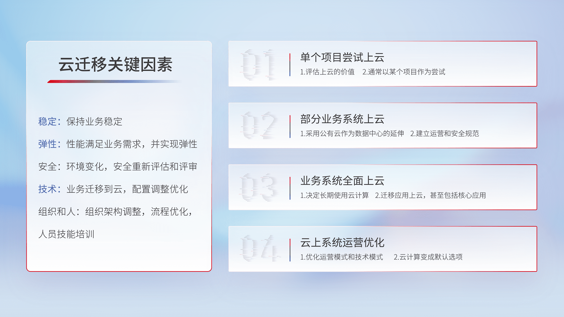 结合实际业务,,从规划设计、、、云平台选型、、、云原生改造、、数据迁移、、集成交付,,,,迁移全过程为客户识别最佳上云路径,,做好风险识别管理,,,,设计网络架构、、、、身份权限、、、安全审计合规、、操作审计、、、日志审计、、、监控告警策略、、、、多站点容灾设计等,,,,对云上基础设施进行整体规划,,提升IT治理水平,,,以满足弹性、、、、高可用、、、高性能的需求。。